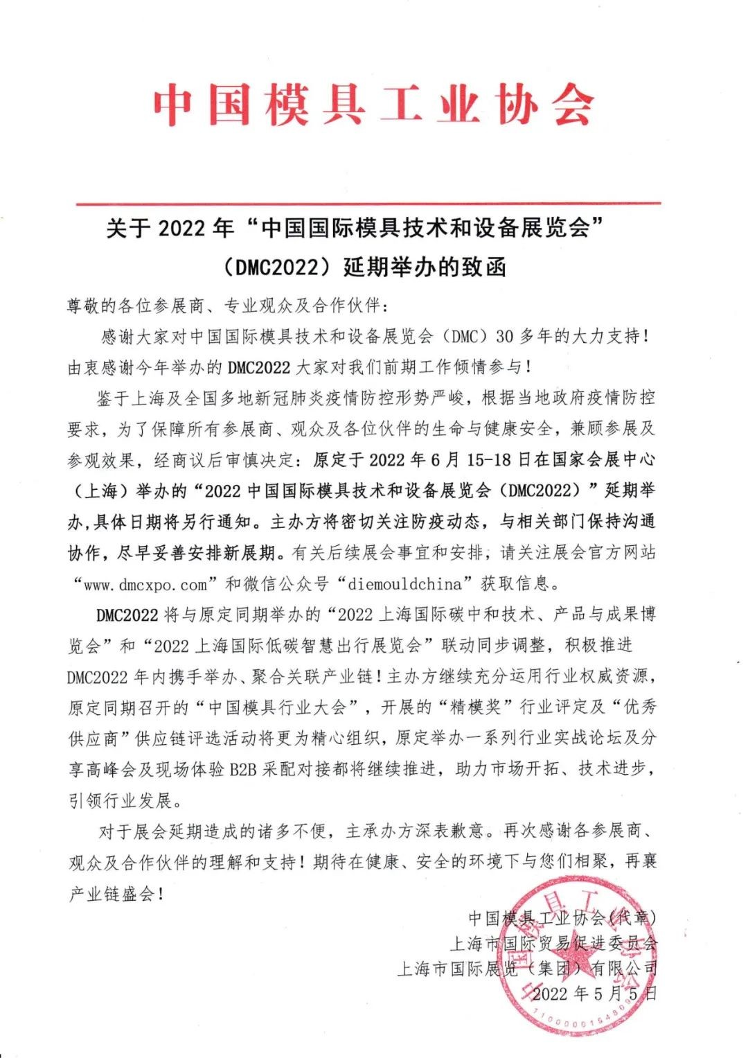 关于“第二十二届中国国际模具技术和设备展览会(DMC2022)” 延期举办通知
