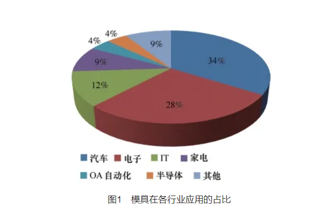 据中国模具工业协会统计数据显示,目前,我国模具产品的主要应用领域集中于汽车、电子、IT及家电等行业。这些行业往往需要精密的工具或零部件,而模具正是为这些行业提供了一种高效、经济的生产方式。在模具应用行业,汽车行业的占比最大,约为34%,电子行业约占28%,IT行业约占12%,家电行业占比9%,OA自动化及半导体分别占比4%,如图1所示。